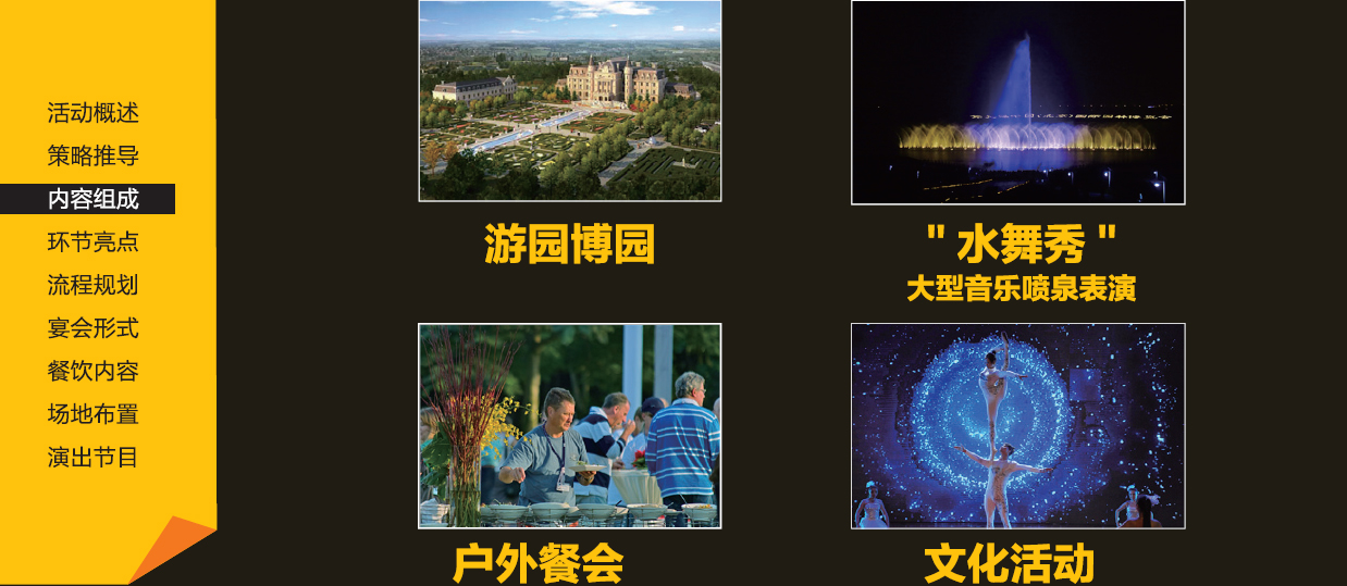 活動(dòng)內(nèi)容:園博園游園 + 戶外冷餐 + 音樂噴泉秀 + 晚會(huì) + 晚宴
